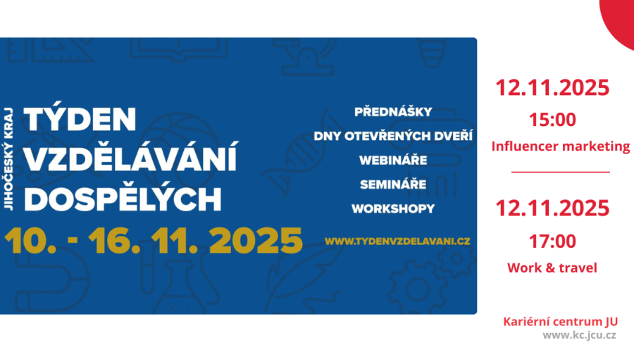 Kariérní centrum JU si pro tuto příležitost připravilo dva atraktivní programy, které spojuje aktuálnost, autenticita a praktický přínos – pro studenty, absolventy i širokou veřejnost.