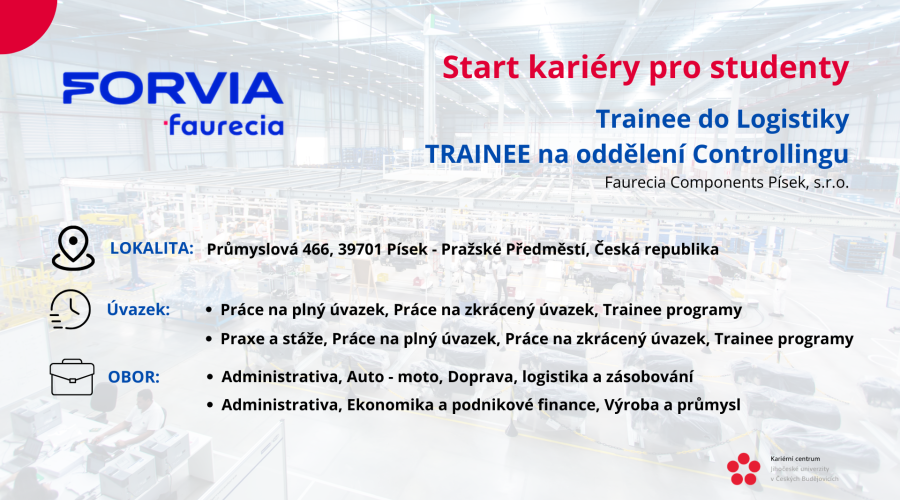 Chcete získat praxi v mezinárodní společnosti ještě během studia? Společnost FORVIA, 7. největší dodavatel automobilového průmyslu na světě, nabízí studentům Jihočeské univerzity možnost zapojit se do trainee programů ve svém závodě v Písku.