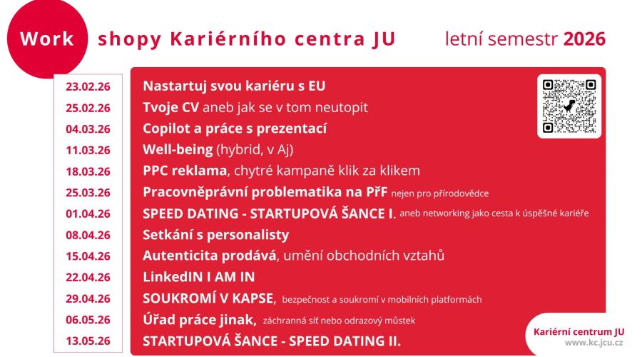 Kariérní centrum JU pro vás připravilo další sérii workshopů a akcí, které vám pomohou lépe se zorientovat, získat náskok a rozvíjet dovednosti, jež se vám budou hodit nejen při studiu, ale i v profesním životě. Čekají vás praktická témata, inspirativní hosté i prostor pro otázky, sdílení a vlastní posun.