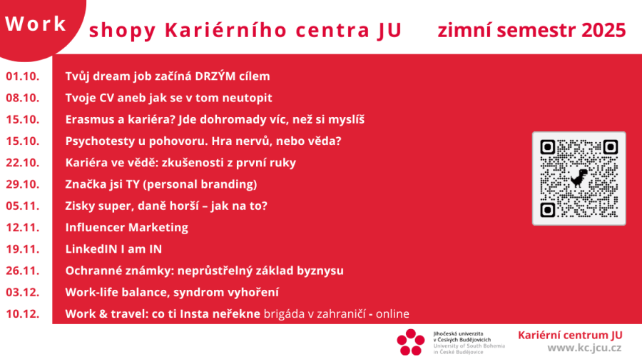 Nový semestr je tady a s ním i čerstvá dávka inspirace a praktických tipů pro váš budoucí kariérní rozvoj. Kariérní centrum JU pro vás i tentokrát připravilo sérii workshopů na aktuální témata, která se vám budou hodit nejen při studiu, ale hlavně do praxe.